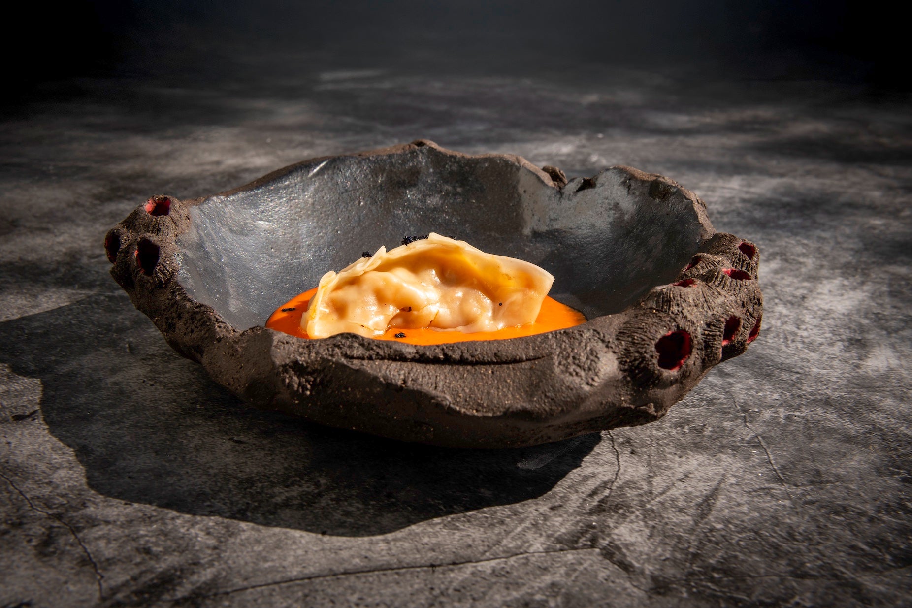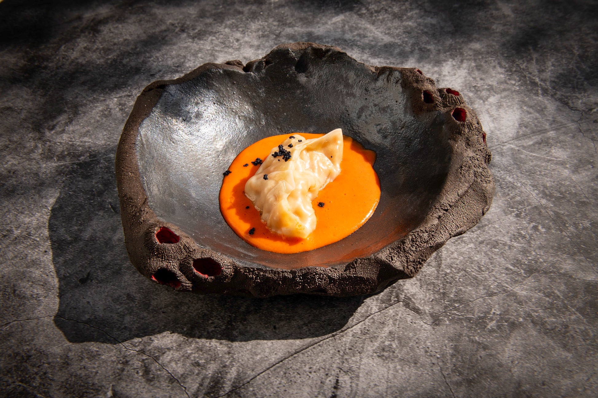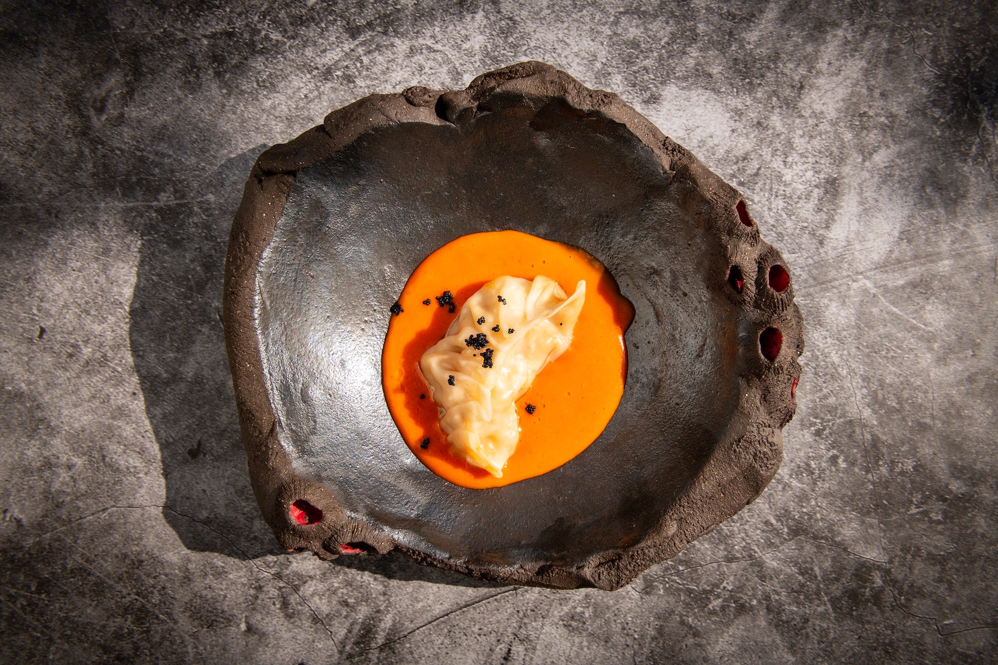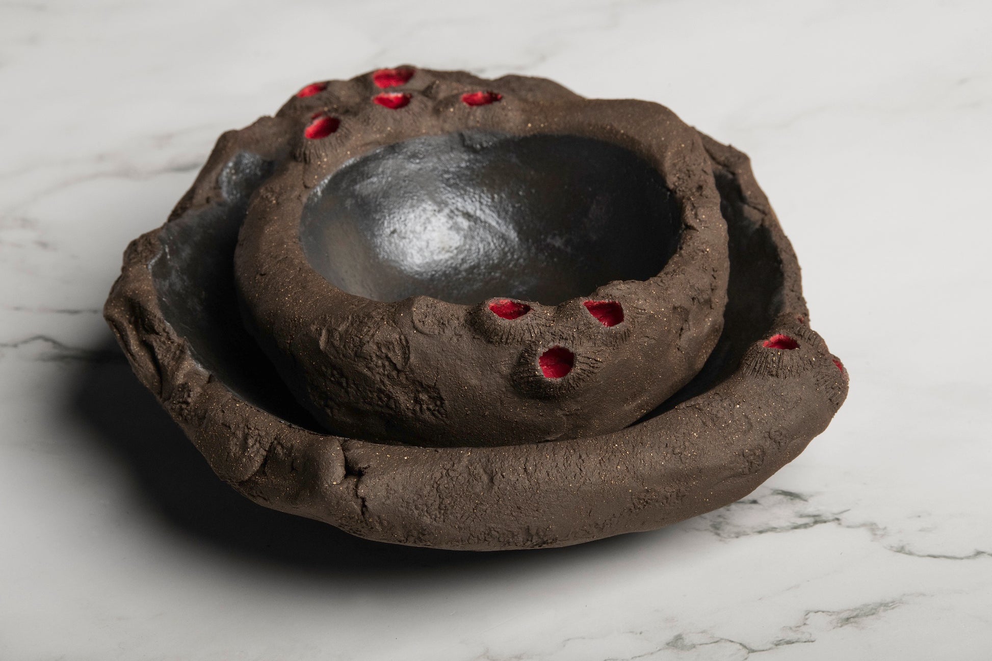 This organic ceramic plate is a unique piece with its own character. It stands out for its earthy black color, evoking the richness of the earth itself, and its smooth, matte texture invites touch, while the subtlety of the sculpted red lapas adds a touch of provocation. Each of these lapas has been carefully crafted, creating a visual contrast that sparks interest without overshadowing the presentation of the food.