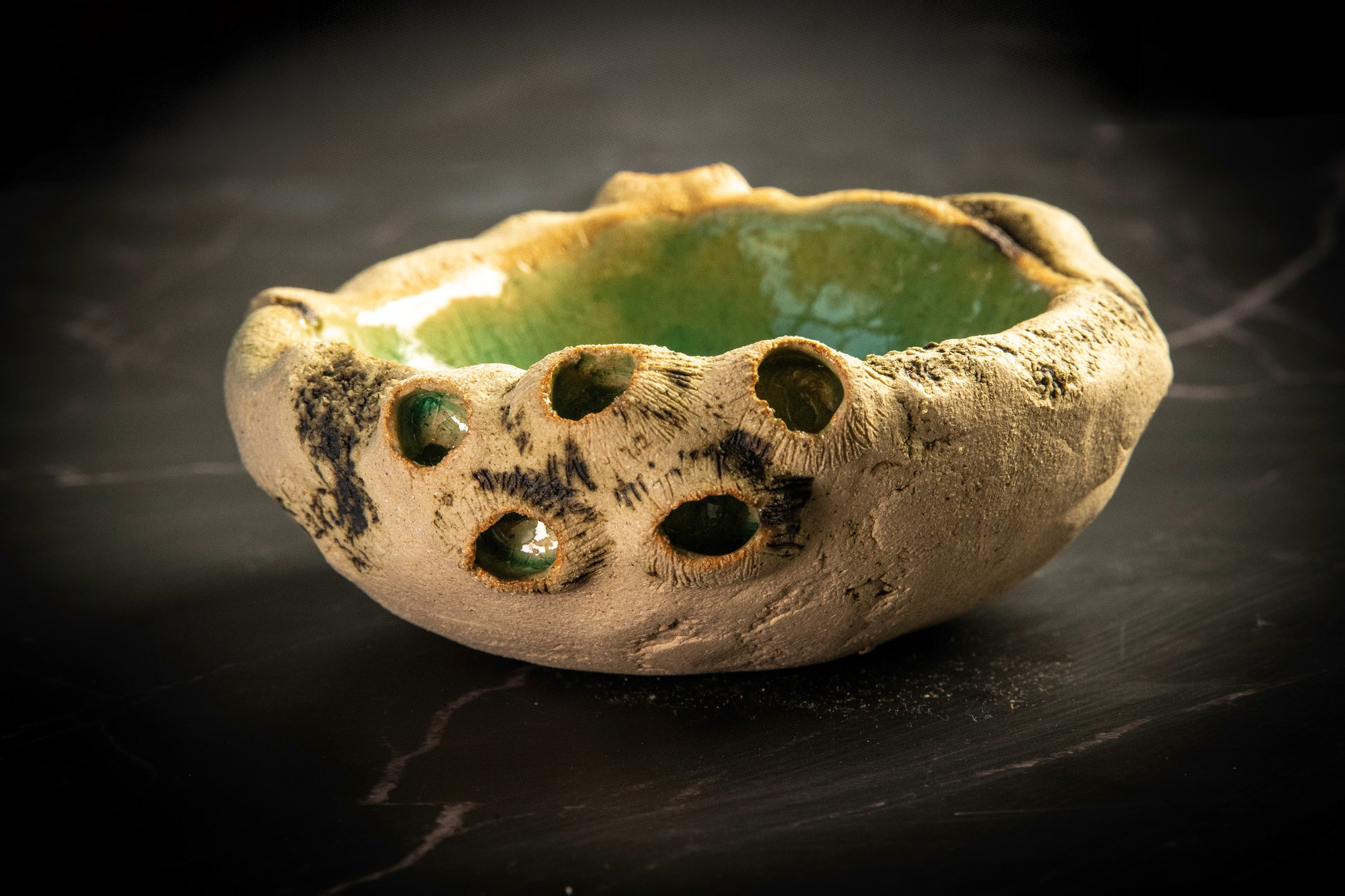This small bowl from the Sea Limpets collection (approximate diameter 12.50 cm, height 5 cm) is intimacy in ceramic. Its spherical, enveloping shape embraces space like a marine nest, while its luminous interior in green tones evokes the warm, tranquil waters of the Mediterranean in its most serene moments.