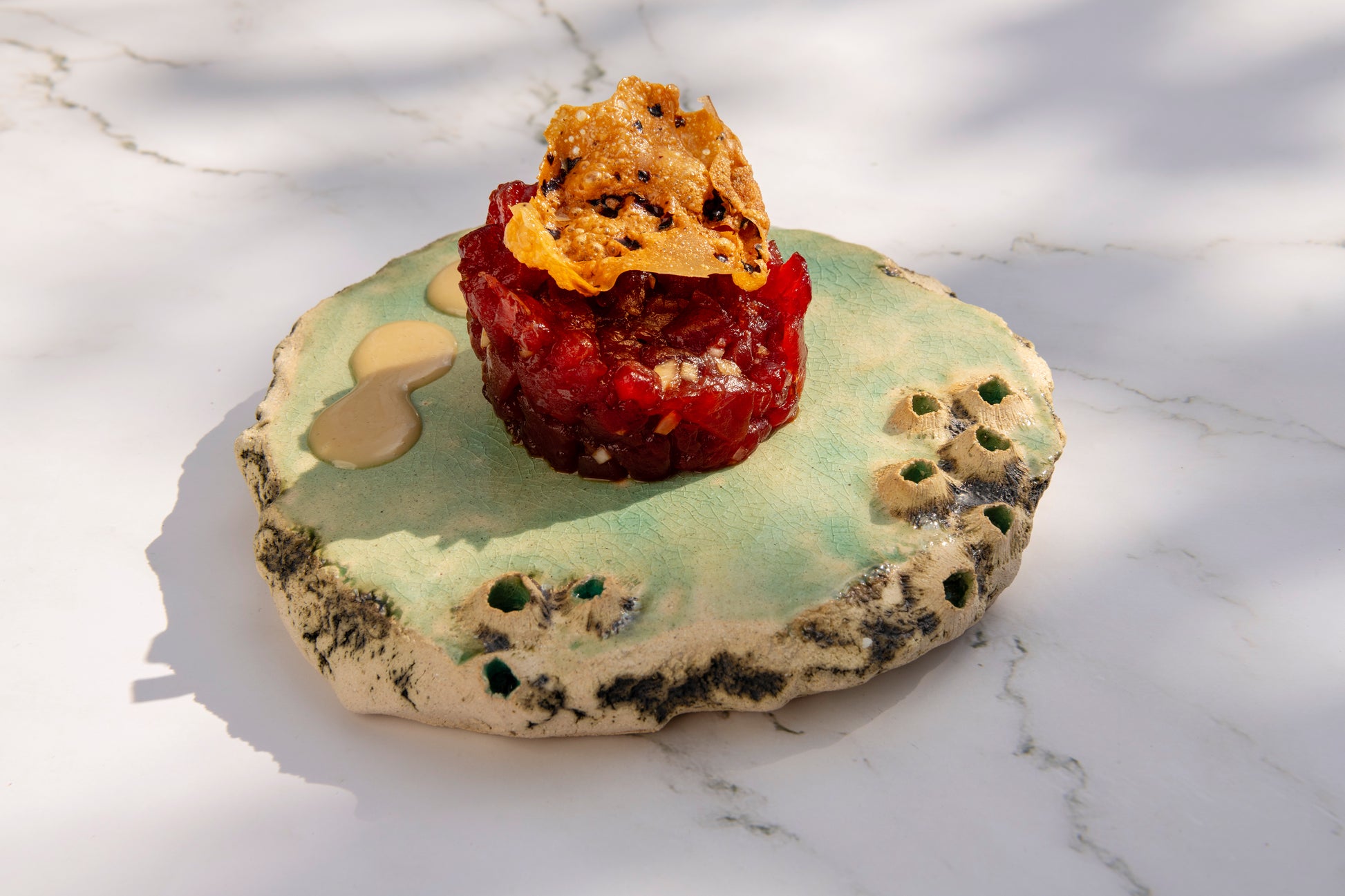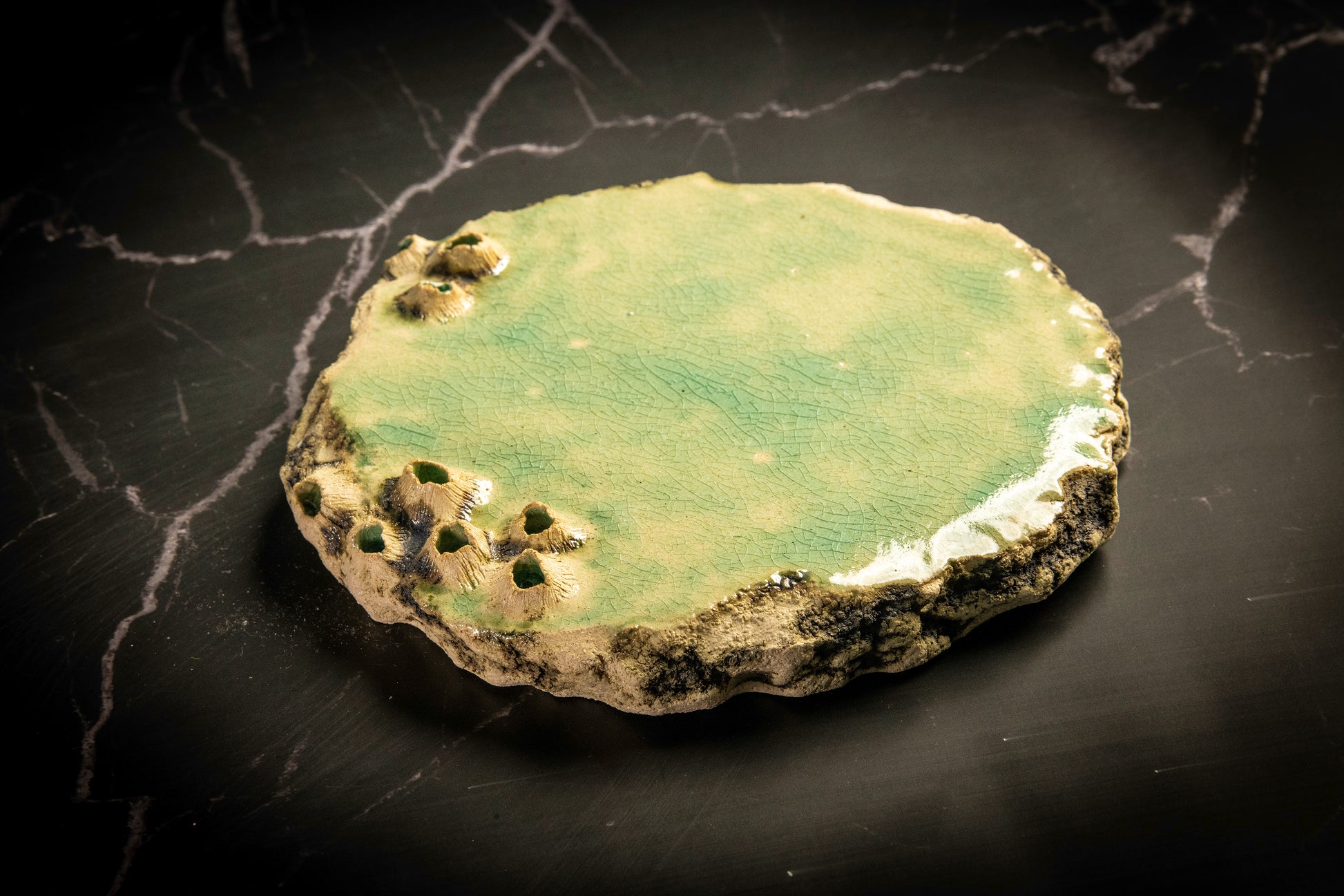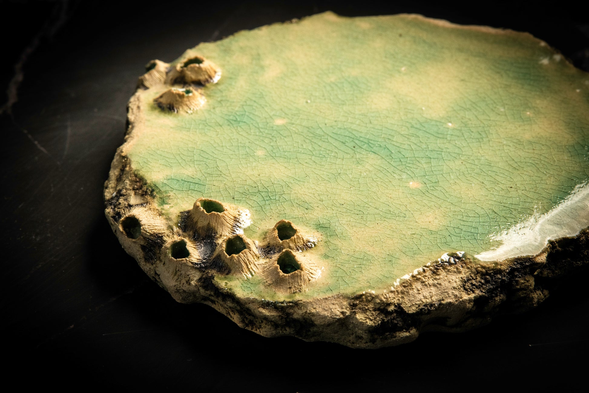 This tapas plate from the Sea Limpets collection (approximate diameter 15 cm, height 2 cm) is expansion and generosity in ceramic. Its shallow, almost flat canvas form opens the space for sharing, for containing multiple flavors and moments of conviviality around the table. The luminous green interior maintains dialogue with the Mediterranean, expanding the marine narrative to a more public and social scale.