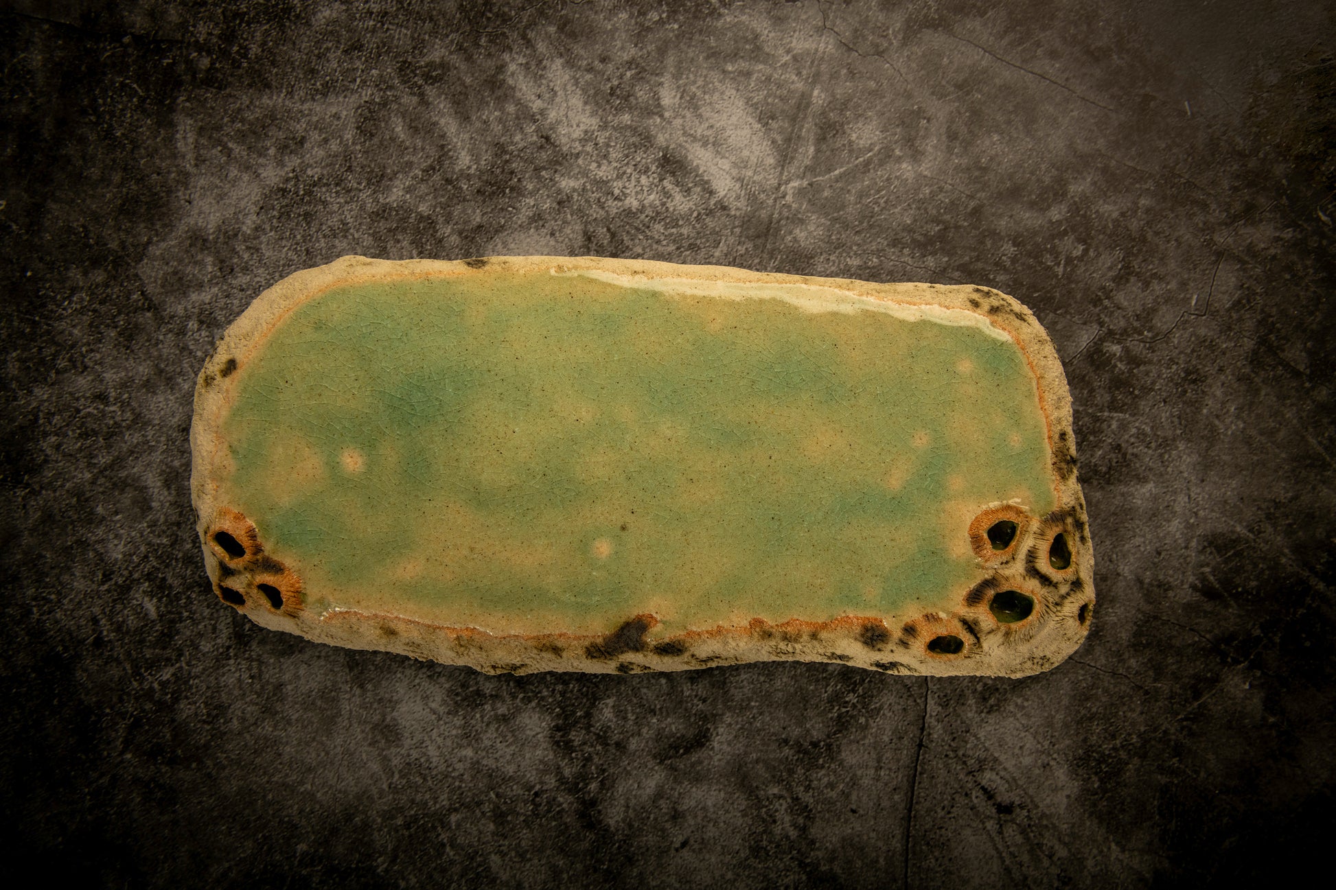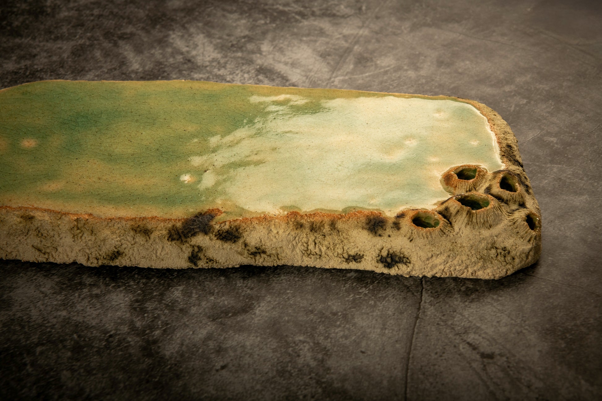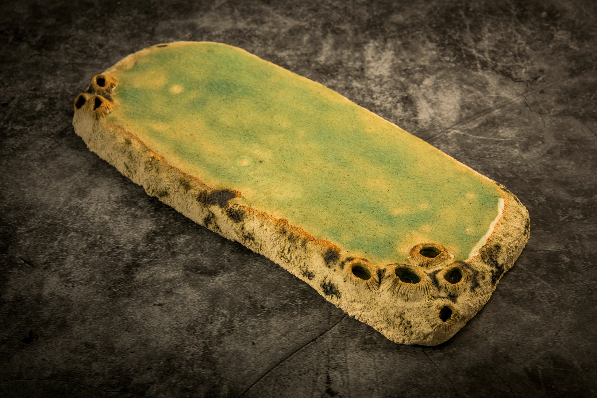 The textured edge and black perforated holes preserve the essence of the sturdy limpets, which, together with the sea green color, evoke a truly Mediterranean dish.
